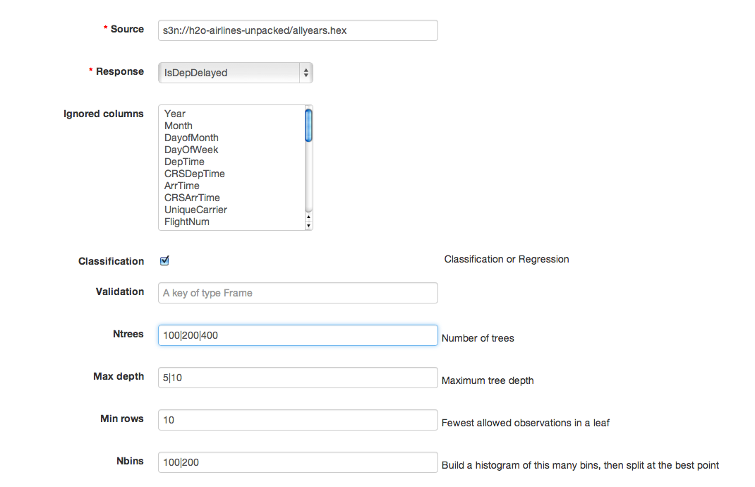 - In Ntrees set the number of trees you would like the model to generate. To specify models with different numbers of trees, enter multiple tree counts separated by pipe (shift + backslash). For example 50|100|150.