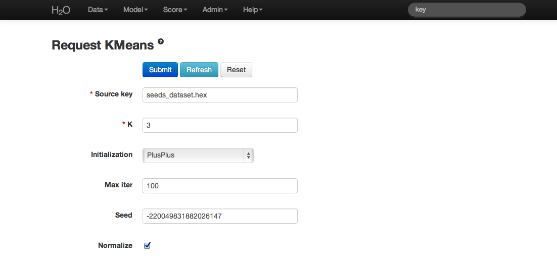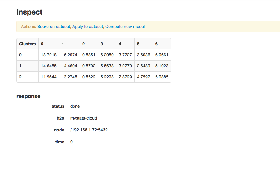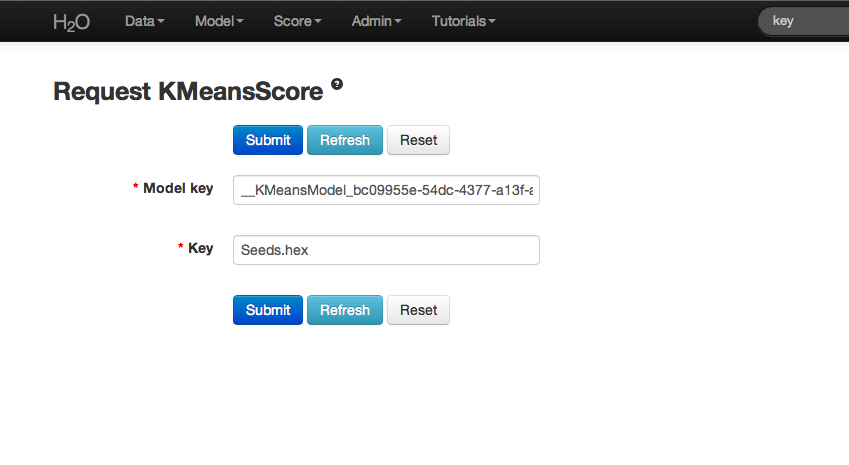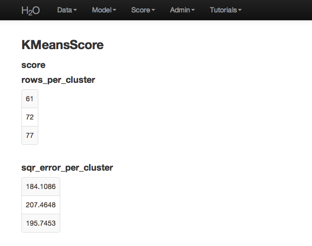 For further information on the model select K-Means from the drop down menu Score. Specify the K-Means model key, and the .hex key for the data set originally used.