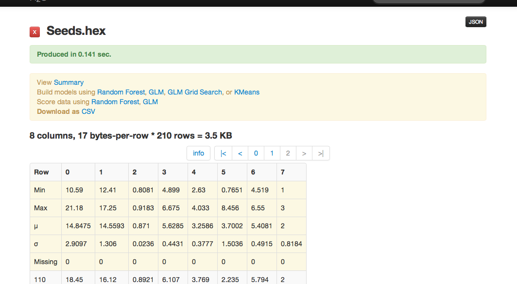 The data are composed of 210 observations, 7 attributes, and an priori grouping assignment. All data are positively valued and continuous. Before modeling, parse data into H2O as follows: