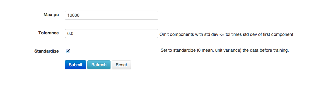 PCA output returns a table displaying the number of components indicated by whichever criteria was more restrictive in this particular case. In this example, a maximum of 5 components were requested, and a tolerance set to 3, so the first 5 components were returned.