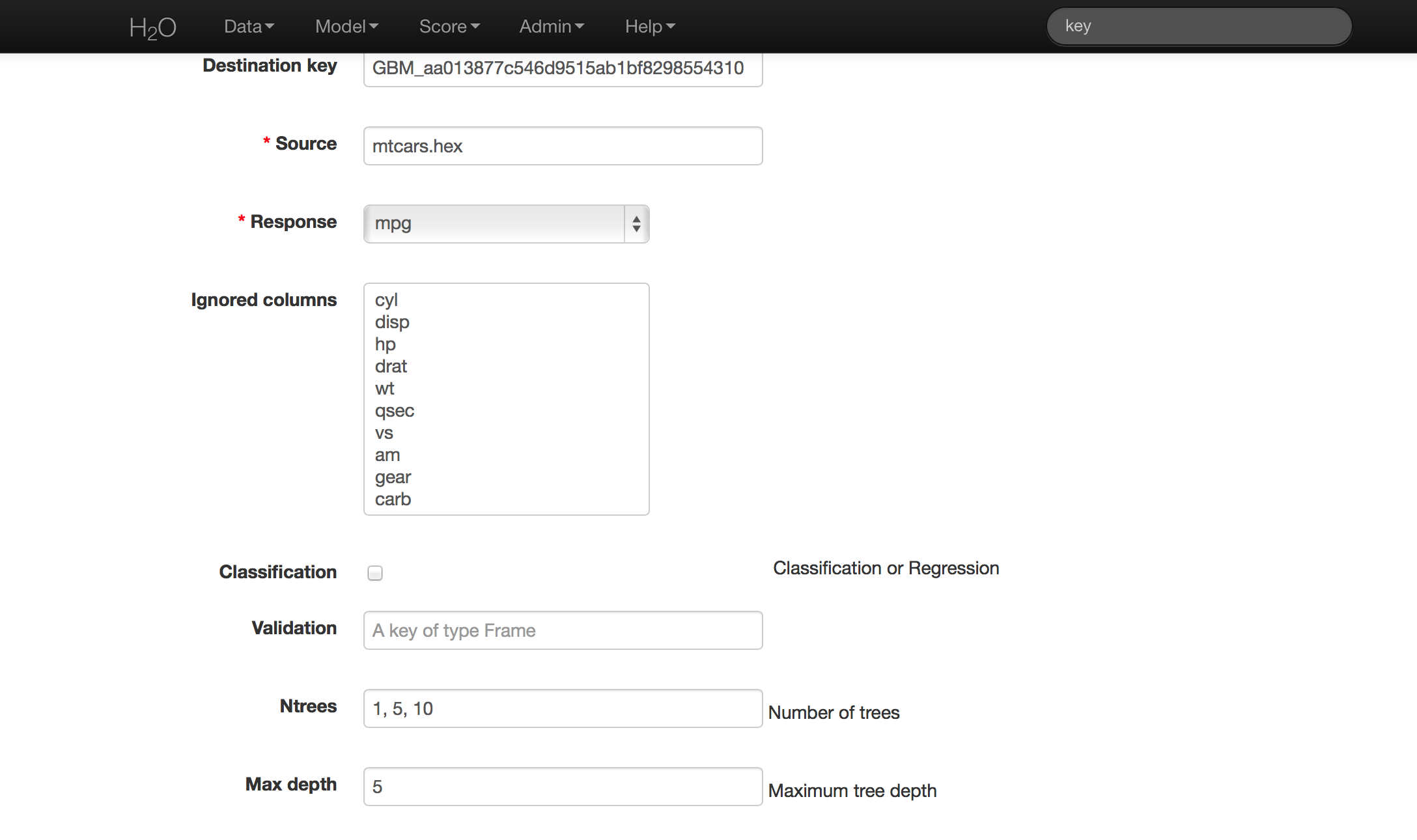 - In Ntrees set the number of trees you would like the model to generate. To specify models with different numbers of trees, enter multiple tree counts separated by pipe (shift + backslash). For example 50|100|150.