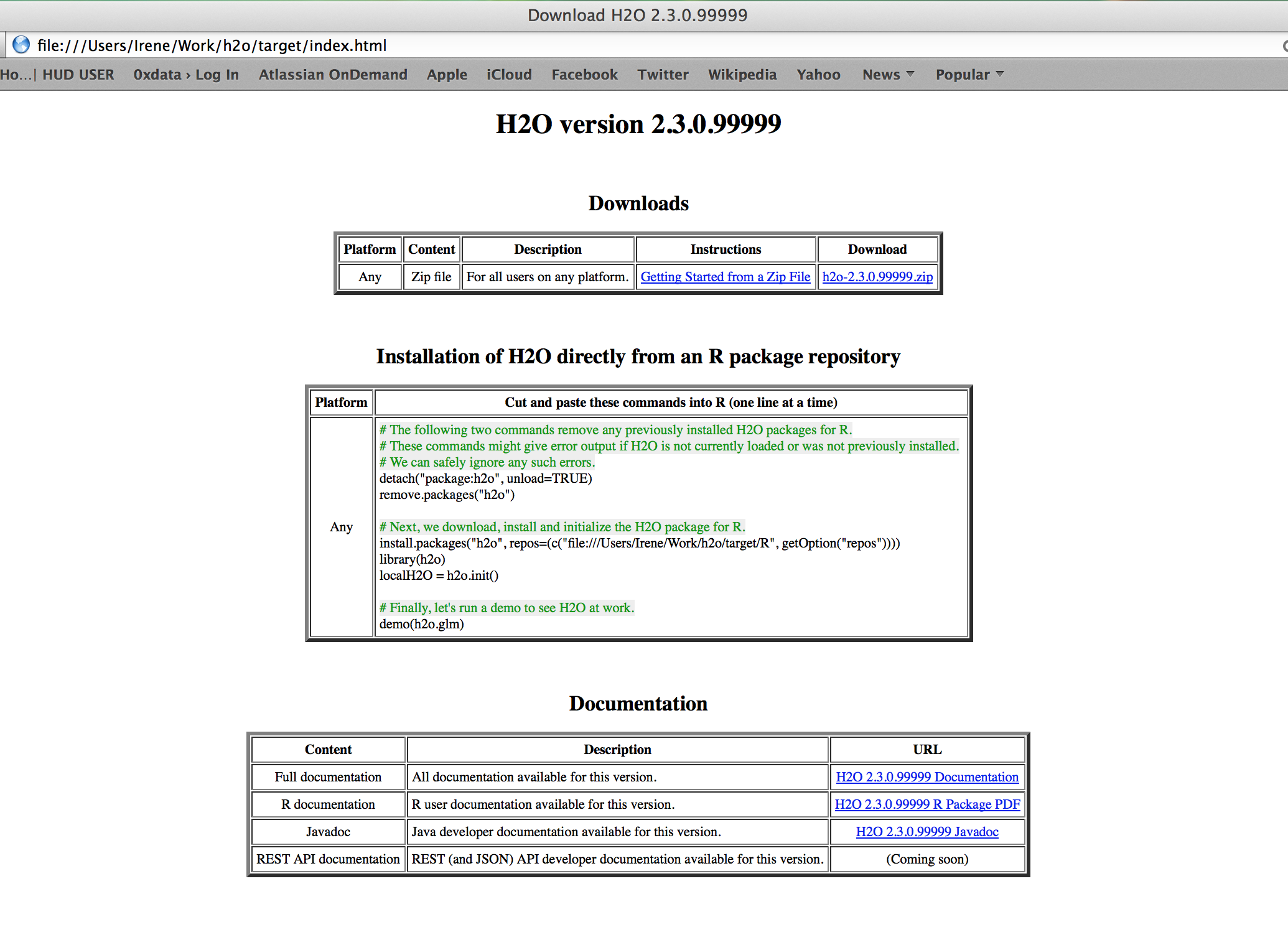 These instructions assume you are using R 2.14.0 or later, and are a developer who is using a local build of H:sub: 2O from Github. If the version in use is from available downloads at http://0xdata.com/downloadtable please close these instructions and visit H2O installation in R Console From Download Table