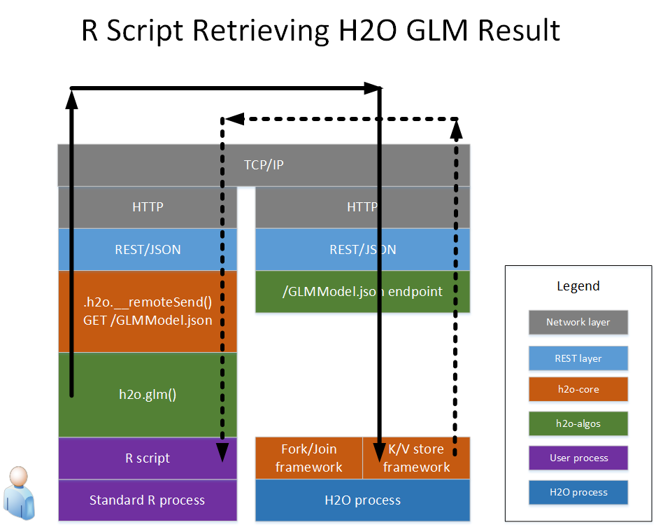 The following diagram shows the different software layers involved when a user runs an R program that starts a GLM on H2O.