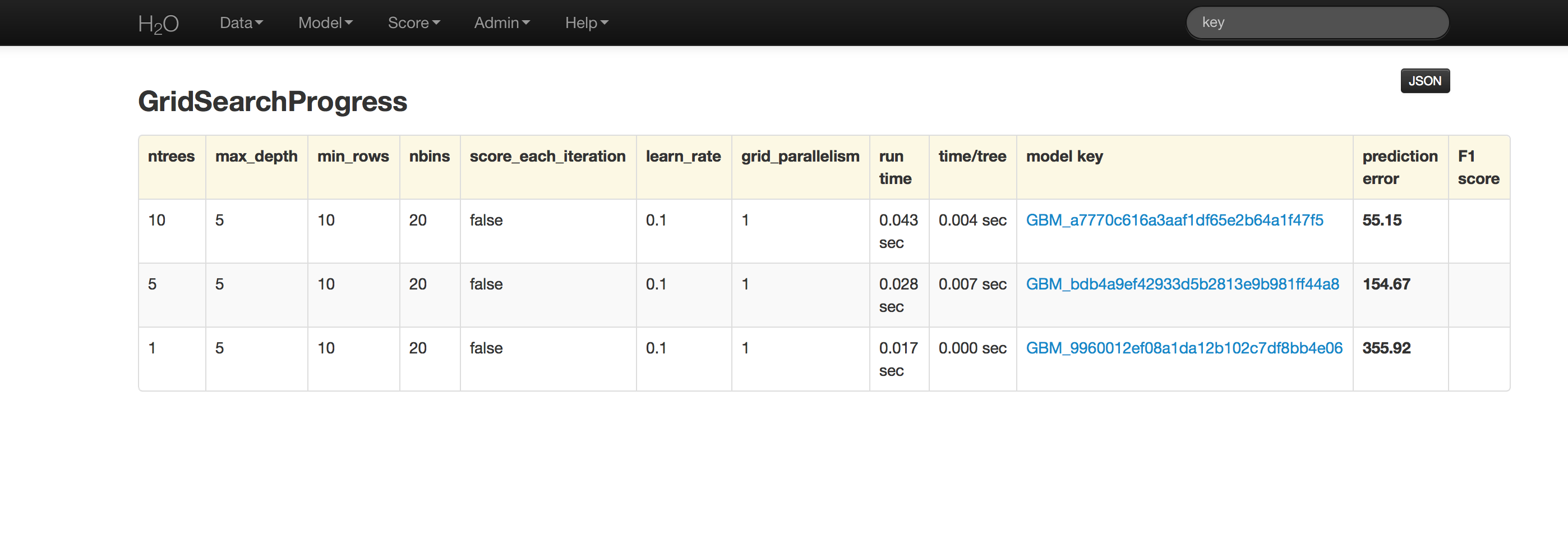 Grid analysis results return a table indicating the level at which each of the tuning parameters were tested in combination and a clickable model key for each. If users specify 3 different levels for Ntrees, and 4 levels for Max Depth, a total of 12 models will be displayed; there is one model for each unique combination of specified tuning parameters. The details of each of these models can be accessed by clicking on the model link provided in the results table.