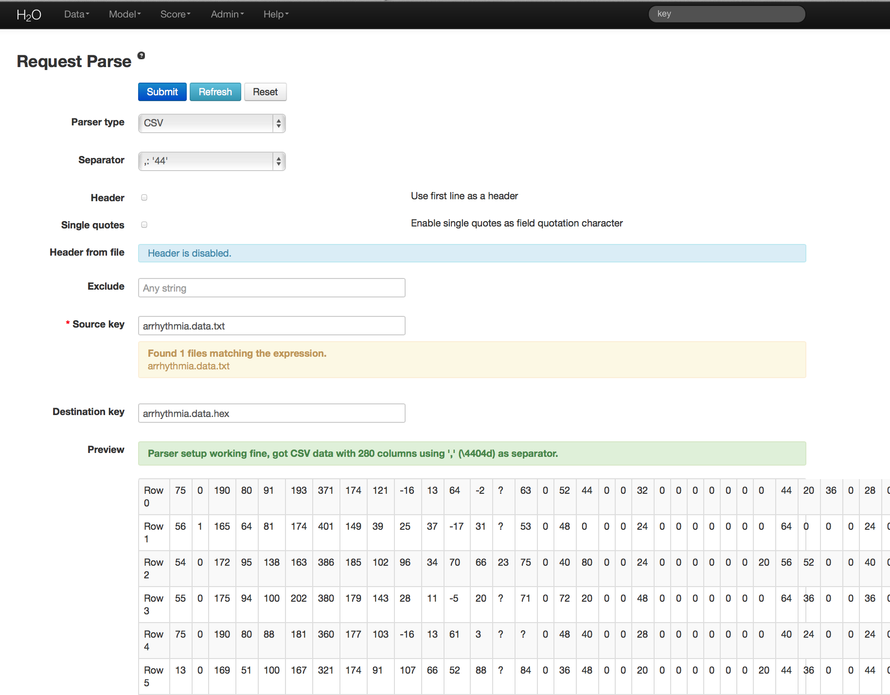 - Parsing data into H2O generates a .hex key (“data name.hex”) Parsing data should look similar to this: