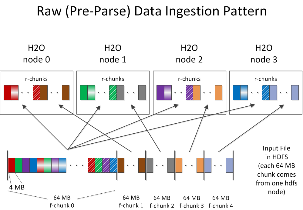 The data is then moved a second time from the H2O node where the raw data gets parsed to the H2O node where the compressed data will reside in a Fluid Vector chunk (a p-chunk in the diagram below).