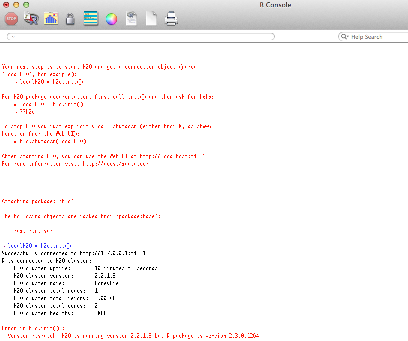 Users may see a response message in R indicating that the instance of H2O running is a different version than that of the corresponding H2O R package. This error will look similar to the picture below. If you get this error, it can be resolved by downloading the correct version of H2O from http://0xdata.com/downloadtable/. Users should follow the installation instructions on the download page.