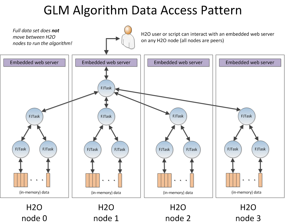 A GLM job gets broken down into MRTask2 tasks, and subsequently into Fork/Join tasks. FJ tasks are spread across the cluster in a logarithmic tree fashion with computation performed at the leaves and results rolled up to the top.