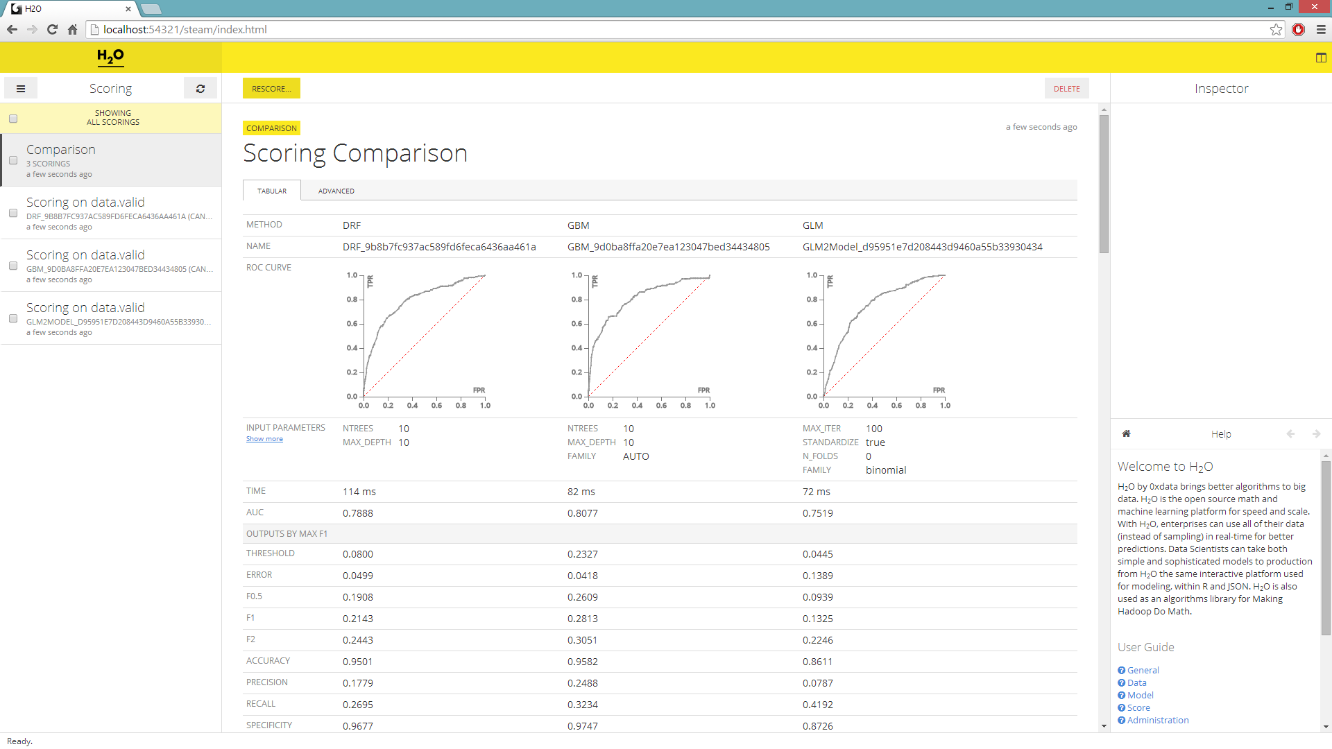 The purpose of this tutorial is to walk users new to H2O’s new scoring feature through H2O’s Multi-modeling Scoring Engine. The tutorial assumes that the user have had some experience building models in H2O and wants to compare the different models build. The Multi-modeling Scoring Engine makes model comparison and model selection user friendly and easy.