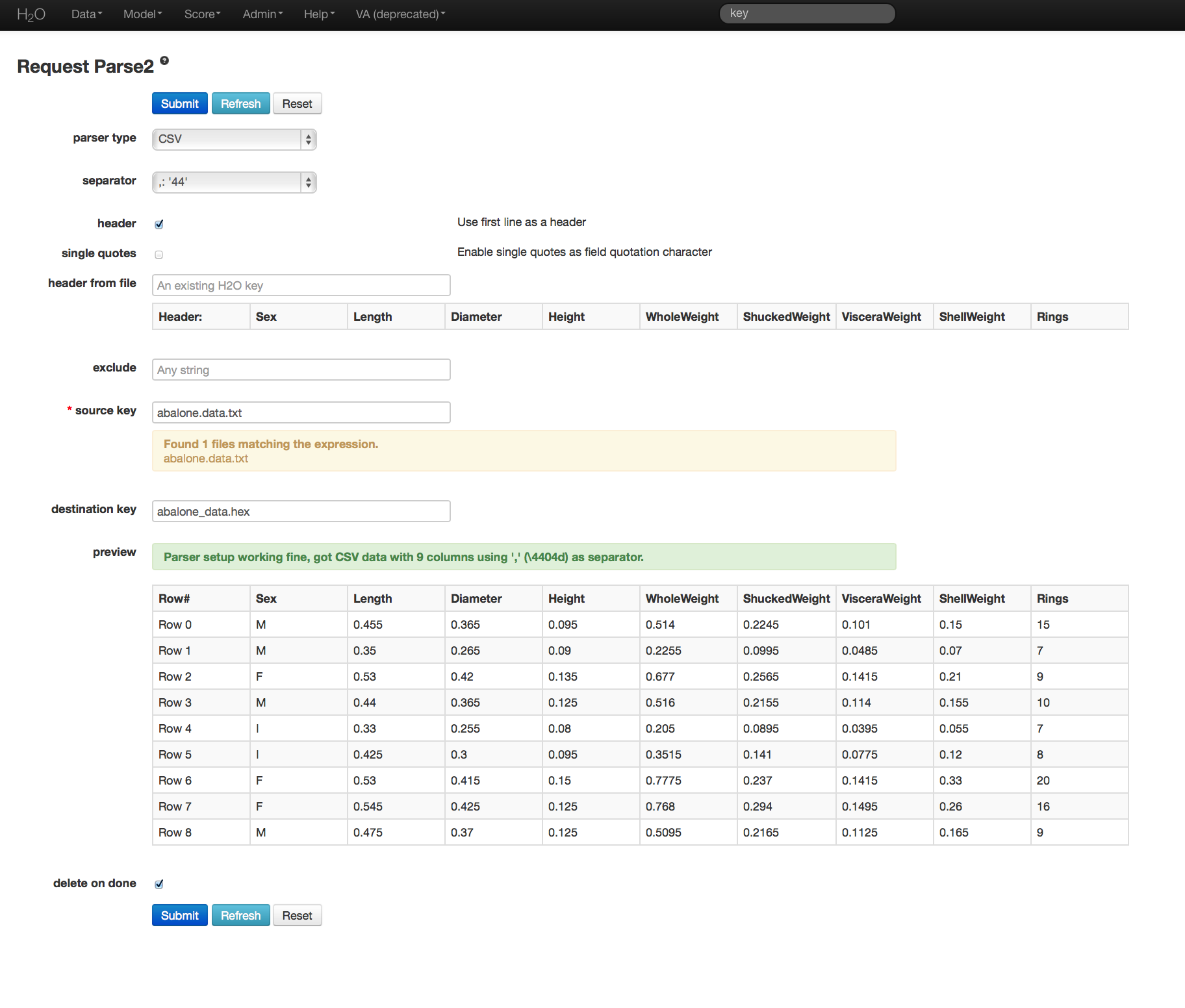 - Parsing data into H2O generates a .hex key of the form “data name.hex”