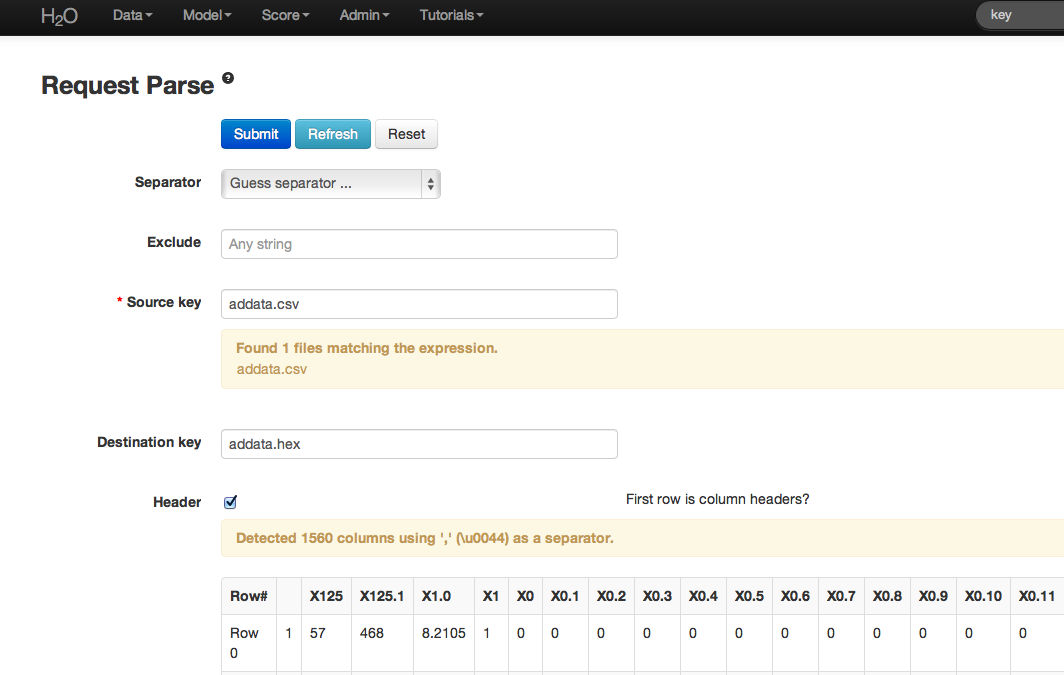 - Click Submit. Parsing data into H2O generates a .hex key (“data name.hex”).