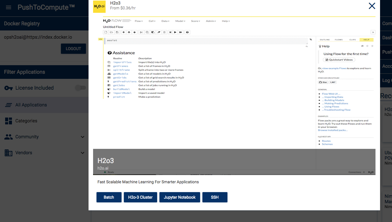 This section shows to run H2O on the Nimbix Cloud and walks you through the following steps: