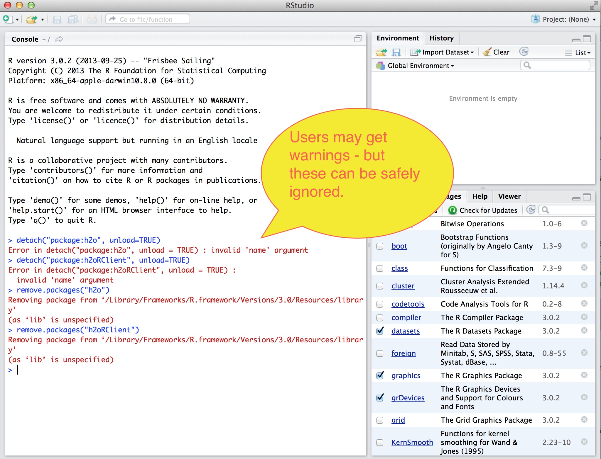 Note: users may get warnings of the type “Error in detatch(“package:h2o”, unload = TRUE): invalid ‘name’ argument. This tells users that there is no h2o package to uninstall. These warnings can safely be ignored.