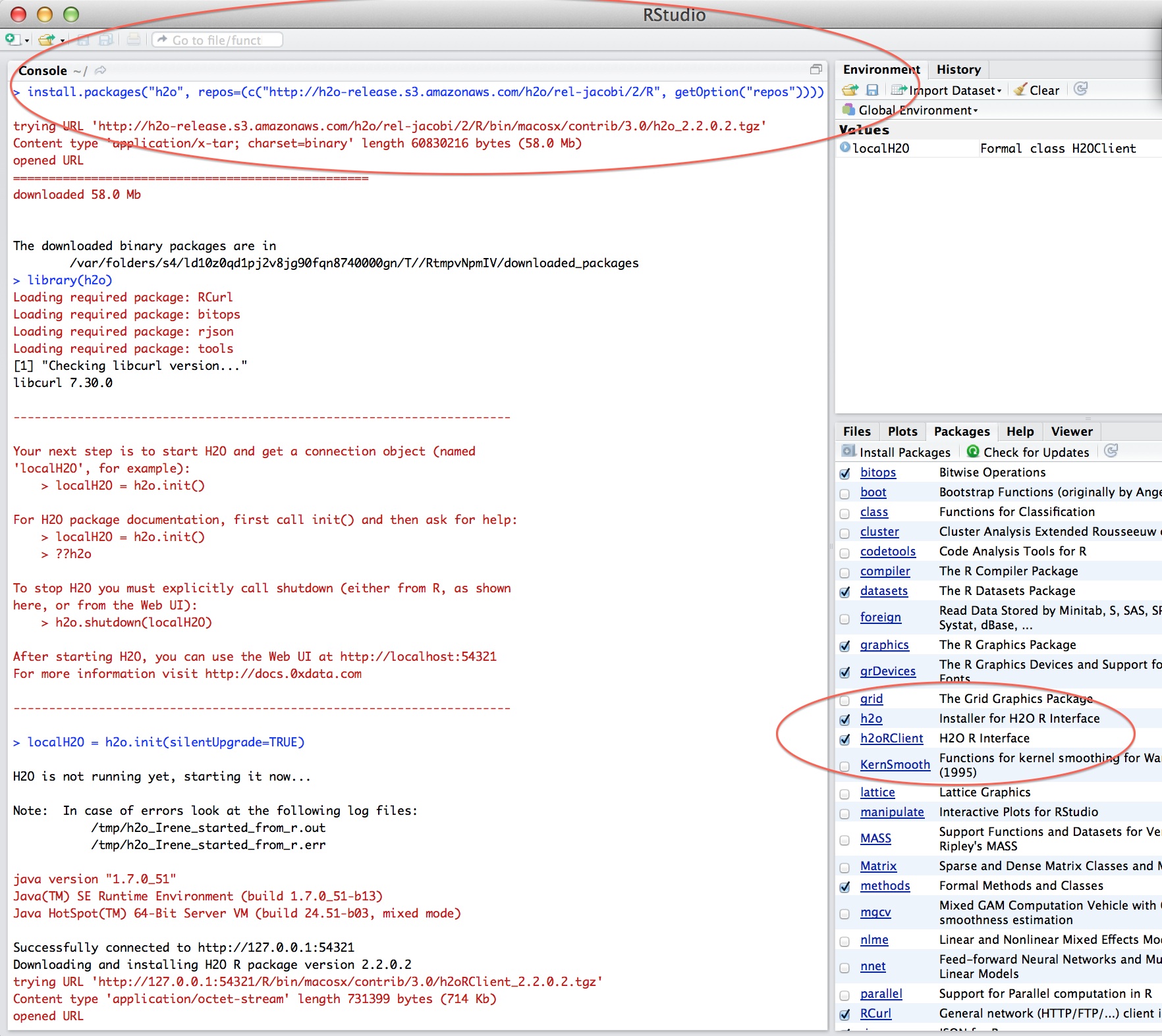 Get R Studio talking to your instance of H2O by typing in the call: