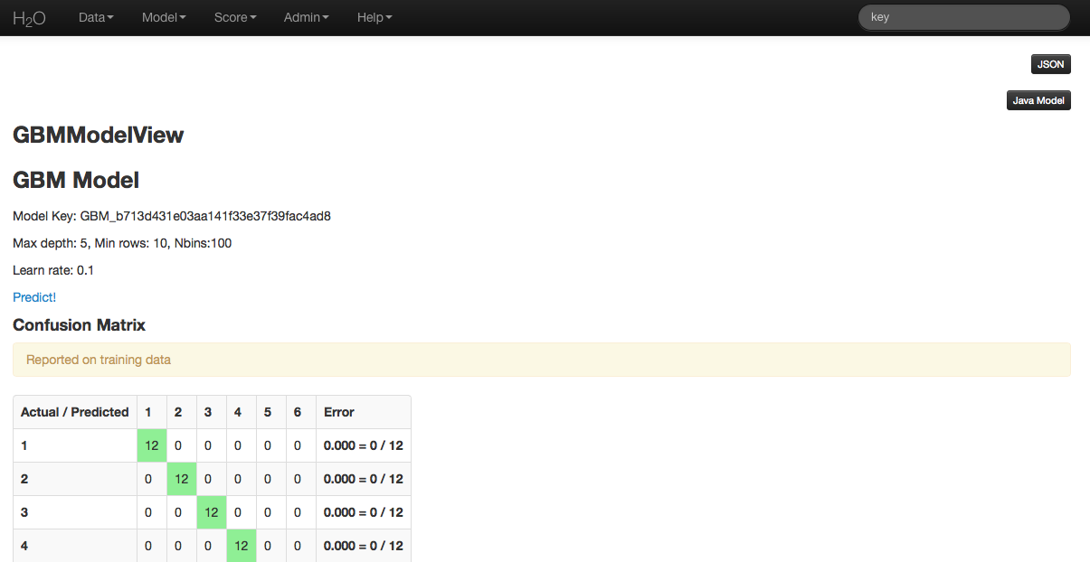 As a beta feature still undergoing testing, GBM models now offer users an option to download a generated GBM model in java code. This new feature can be accessed by clicking Java Model in the upper right corner. When the model is small enough, the java code for the model will be made available to inspect from within the GUI, larger models can be inspected after users have downloaded the model.