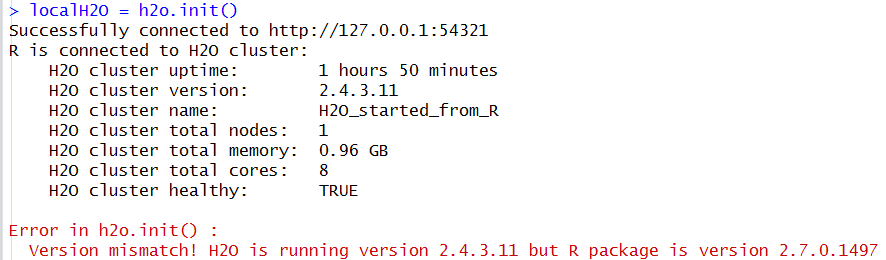 If the version of H2O instance running is different from the package version loaded in R, a warning message indicating a version mismatch will appear. To fix this issue either update the R package or launch an H2O instance using the jar file from the installed package.