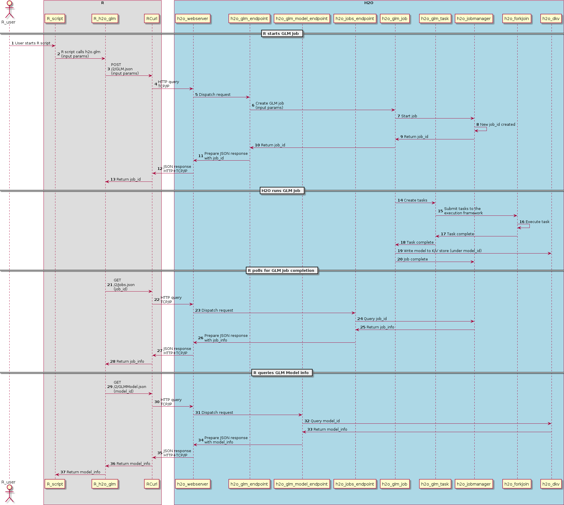 An end-to-end sequence diagram of the same transaction is below (click on the diagram to zoom). This gives a different perspective of the R and H2O interactions for the same GLM request and the resulting model.