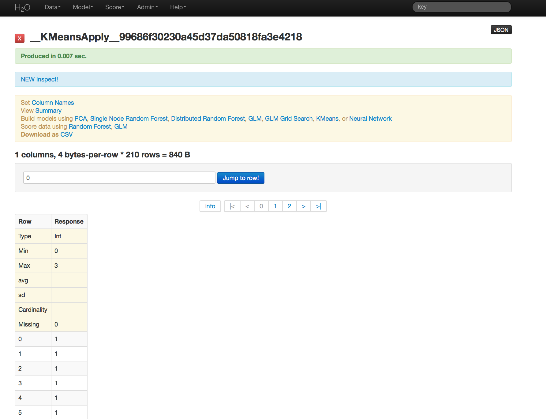 For further information on the model select K-Means from the drop down menu Score. Specify the K-Means model key, and the .hex key for the data set originally used.
