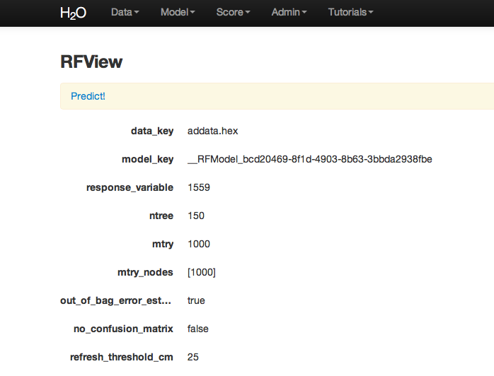 All jobs created in the current instance of H2O will be listed here. Find the appropriate job (here labeled “Random Forest 150 Trees”). Save the associated key to clipboard, and paste into the model key field in the Request Generate Predictions Page. Enter a .hex key associated with a parsed data set other than the one used to build the model.