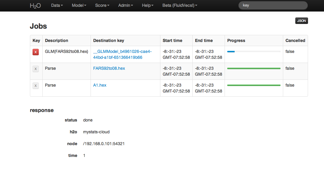 Users can access information on each action undertaken in an instance of H2O by accessing Jobs under the Admin drop down menu. From here it is possible to find .hex keys associated with models and parsed data. If a an action was cancelled, that information will be displayed here as well.