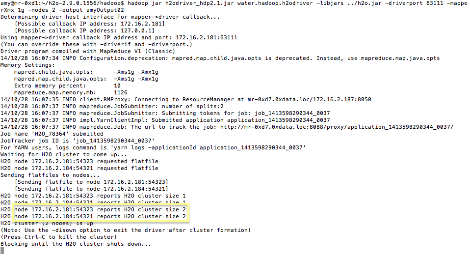 $ hadoop jar h2odriver_hdp2.1.jar water.hadoop.h2odriver -libjars ../h2o.jar -mapperXmx 1g -nodes 1 -output hdfsOutputDirName