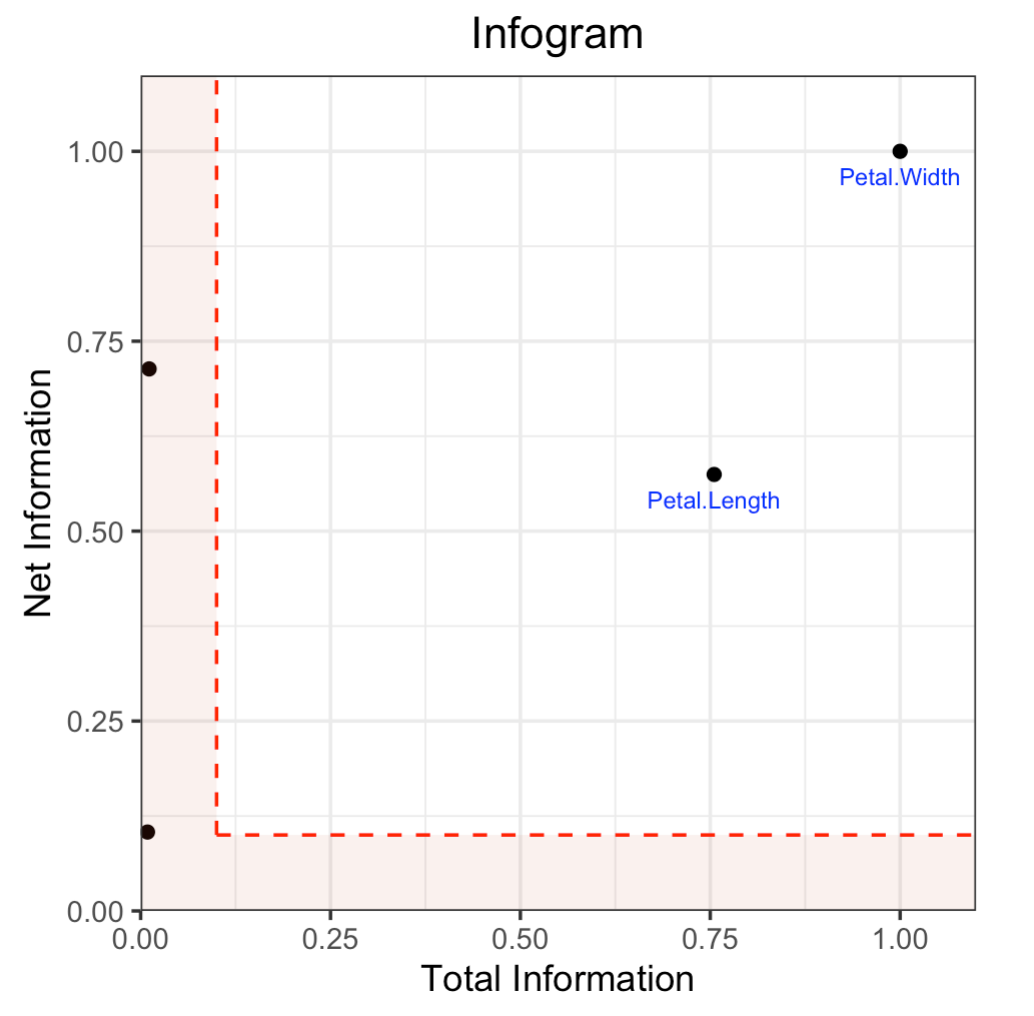 total_information_threshold, that feature will be considered admissible. The net information is the y-axis of the Core Infogram.total_information_threshold: A number between 0 and 1 representing a threshold for total information, defaulting to 0.1. For a specific feature, if the total information is higher than this threshold, and the corresponding net information is also higher than the threshold