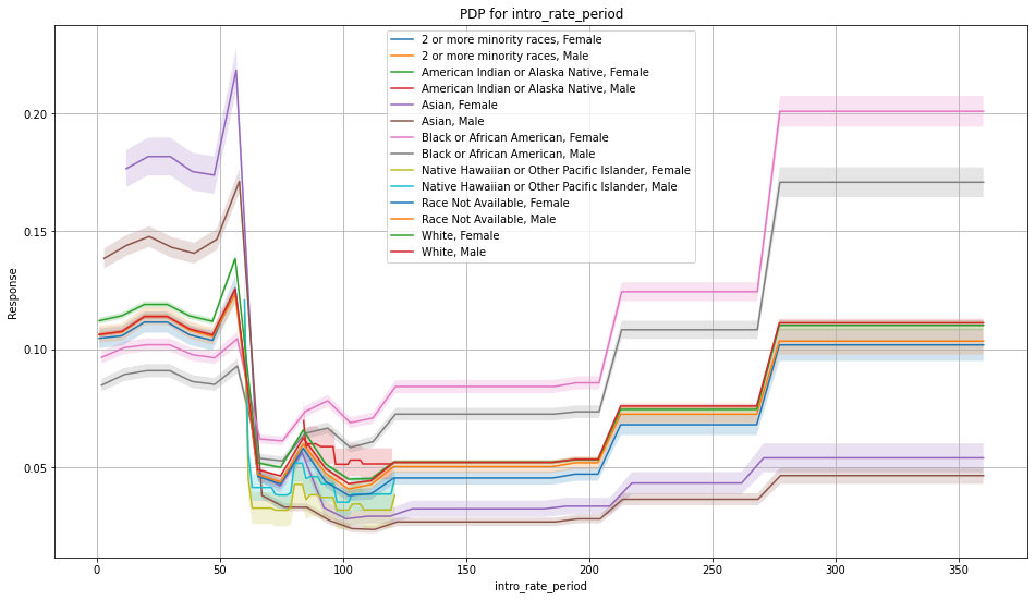 The PDP plots show one curve per intersection. Ideally, the lines should be overlapping as those intersections are created just based of the protected columns.