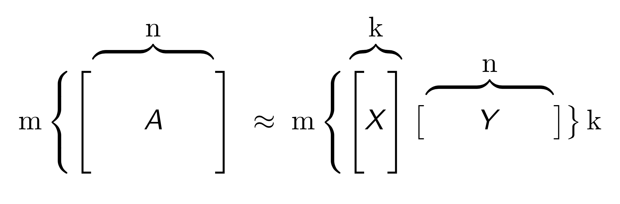 Both X and Y have practical interpretations. Each row of Y is an archetypal feature formed from the columns of A, and each row of X corresponds to a row of A projected into this reduced dimension feature space. We can approximately reconstruct A from the matrix product XY, which has rank k. The number k is chosen to be much less than both m and n: a typical value for 1 million rows and 2,000 columns of numeric data is k = 15. The smaller k is, the more compression gained from the low-rank representation.